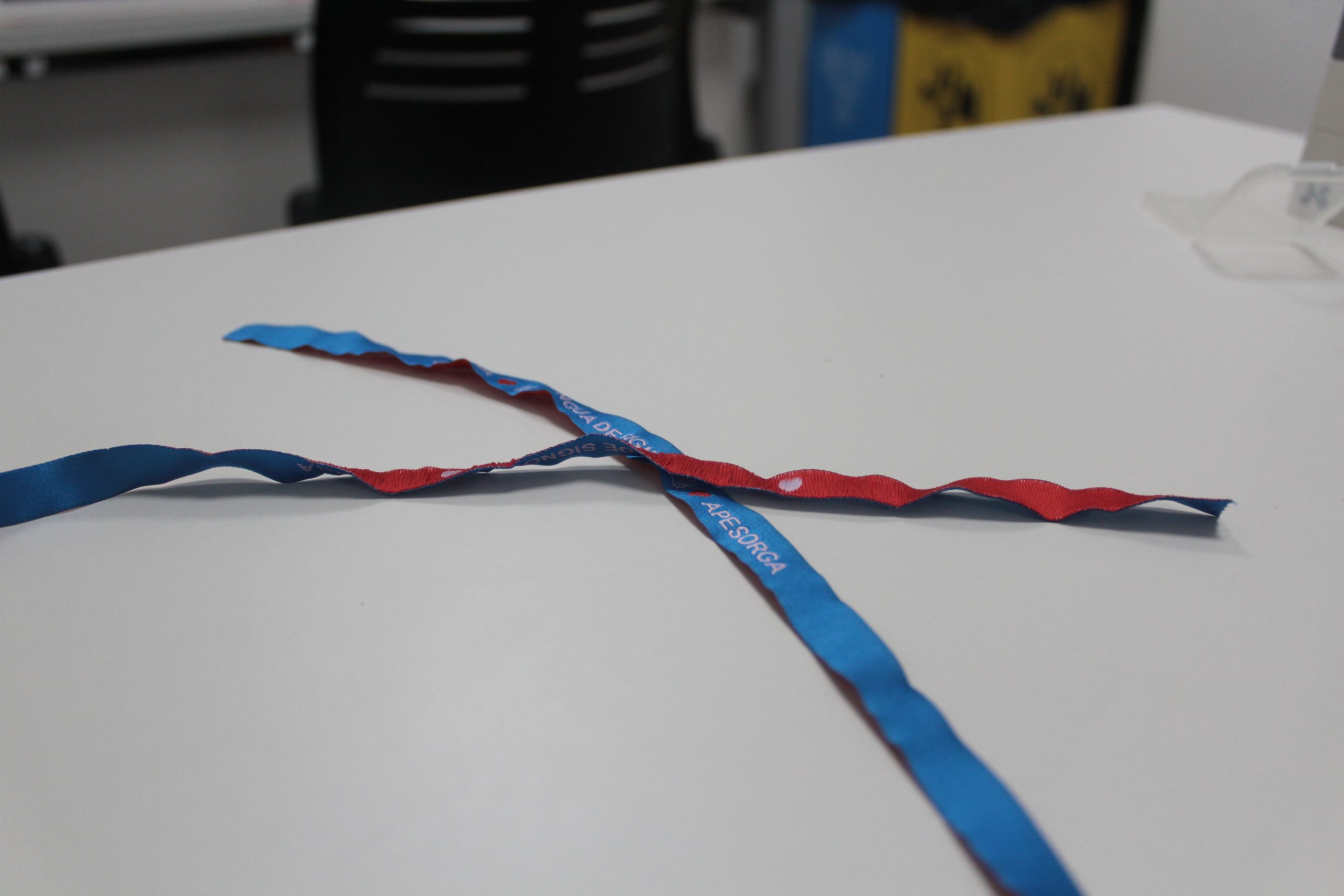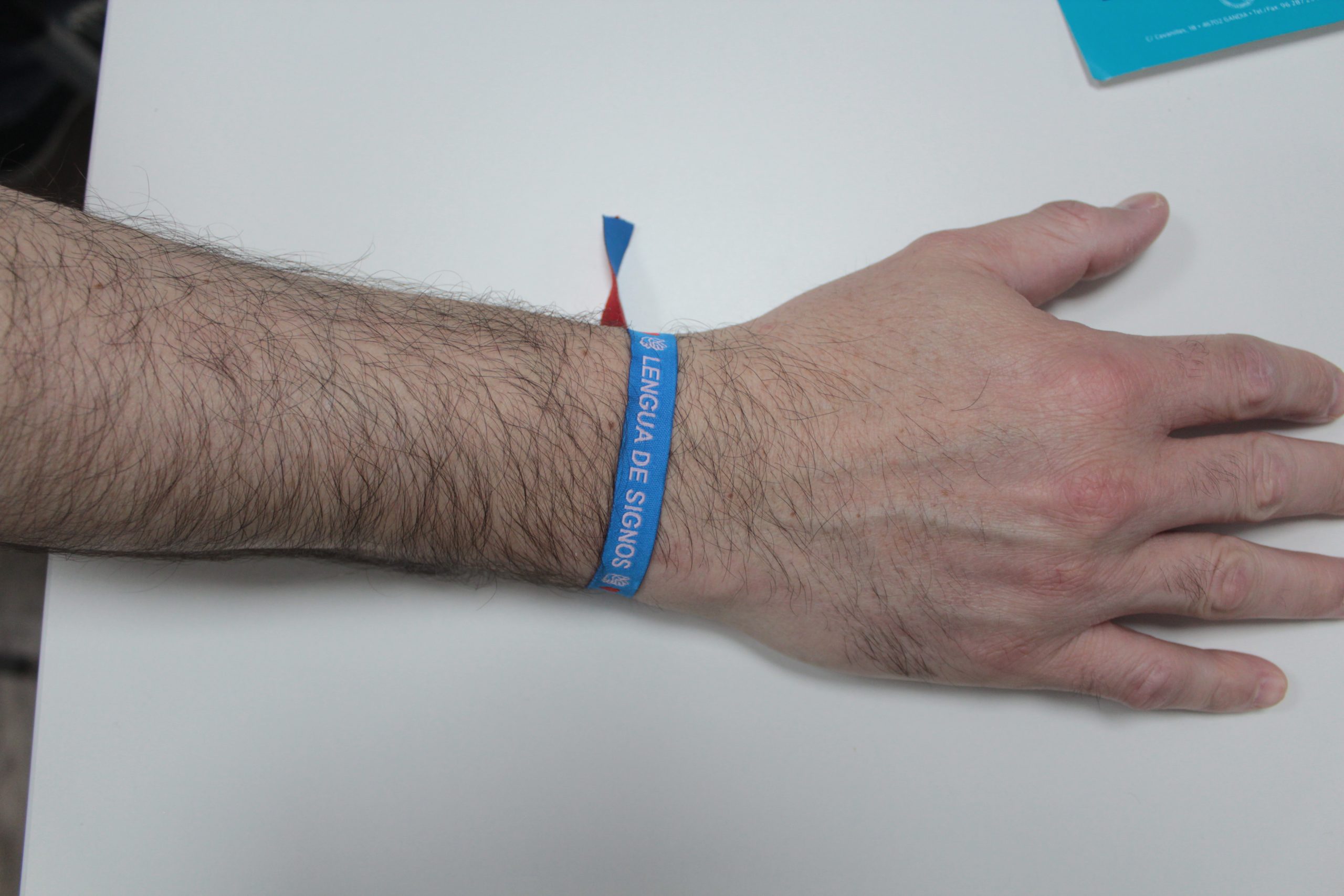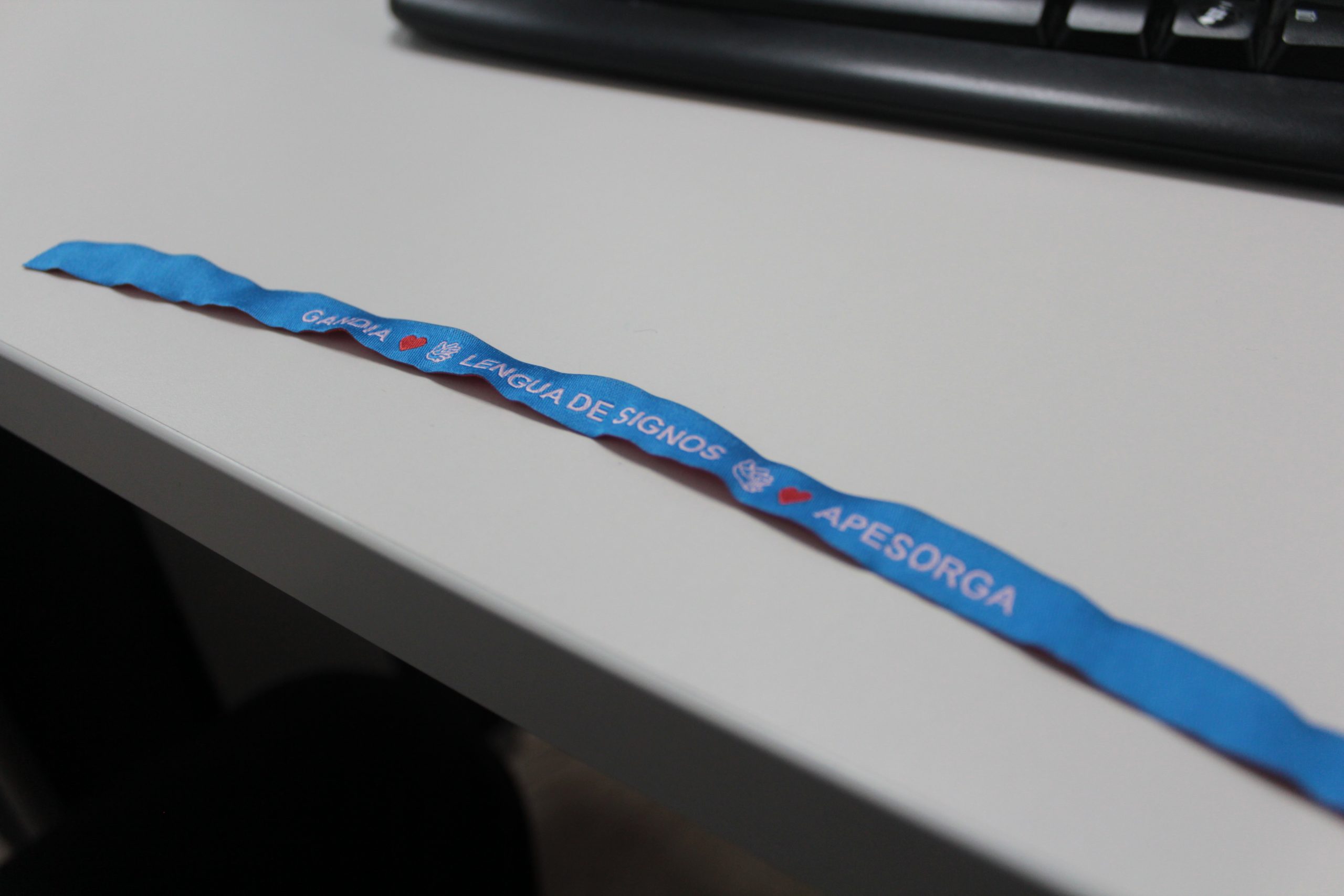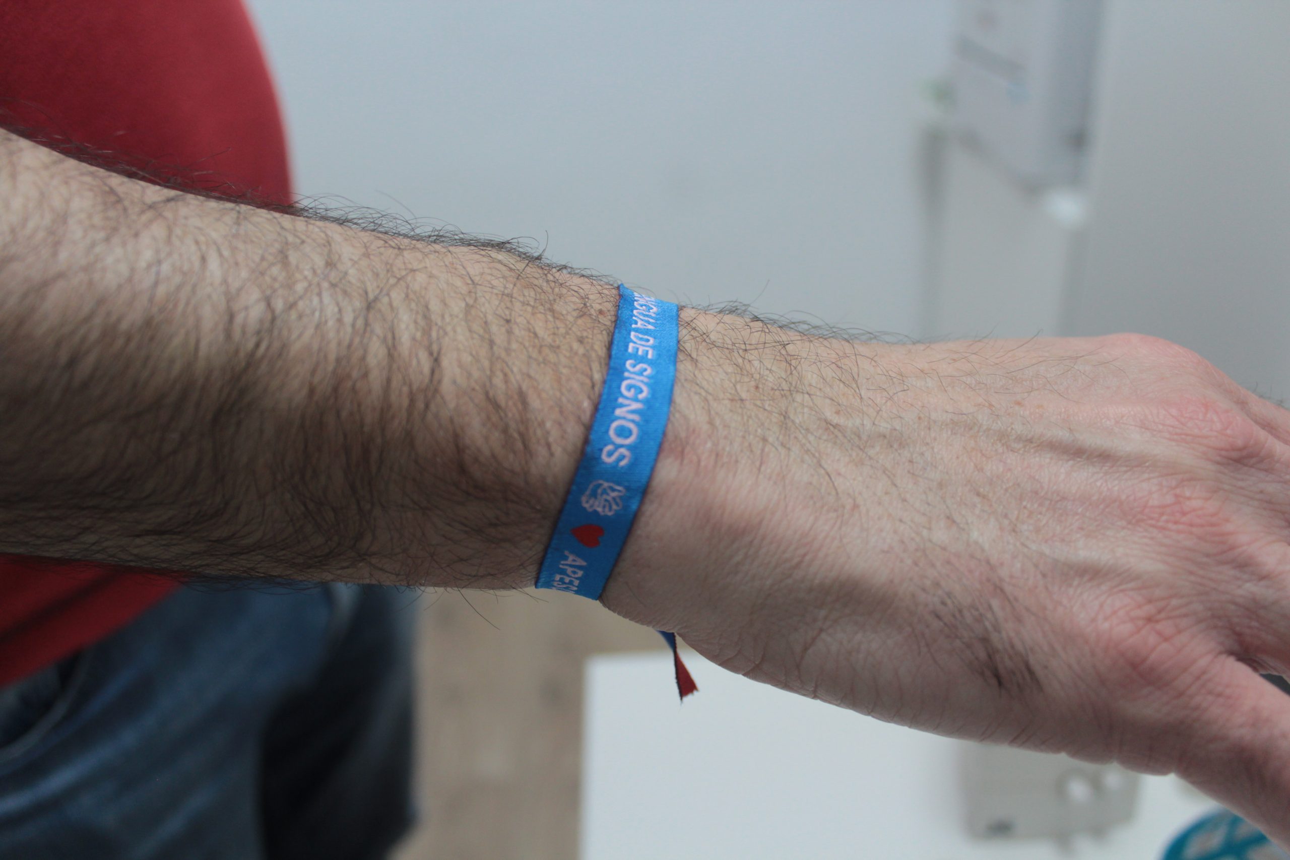 Pulseras de APESORGA. En color azul y rojo con el texto «Gandía – Lengua de Signos – APESORGA». ¡También sirven como marca páginas!